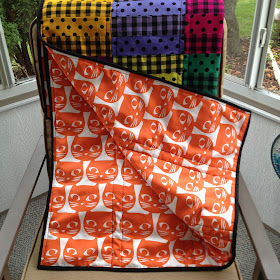 Unfortunately, the two fabric combination type did not play well with each other when I sewed the blocks together, I could not get the seams to line up with each other so I decided what I needed to do was to separate the two; make one with the dyed dots/checks blocks and one with the twill/black blocks. For some reason, I was planning on using another backing for the dyed dots/checks blocks and the Ernie fabric for the twill combination but divine inspiration made me realized that the Ernie fabric would look great with the dyed dots/checks since the colors are so bright and happy.